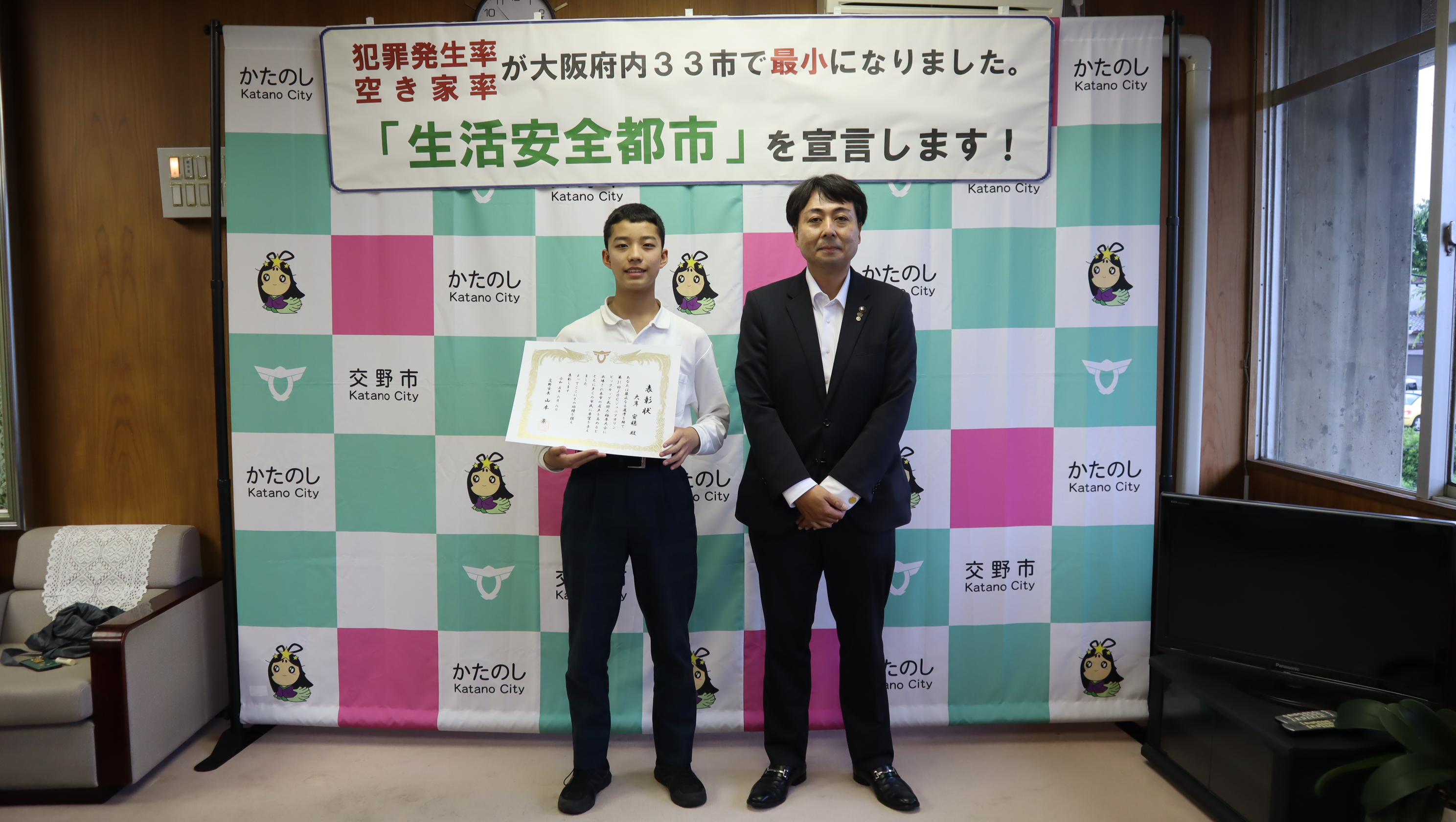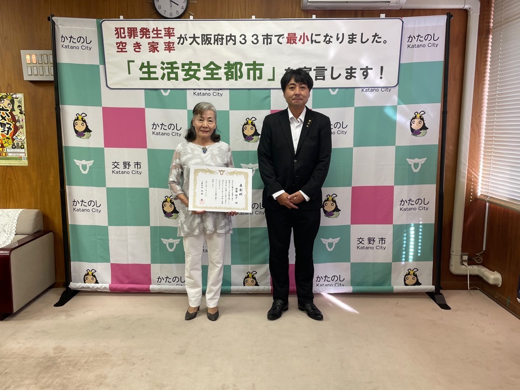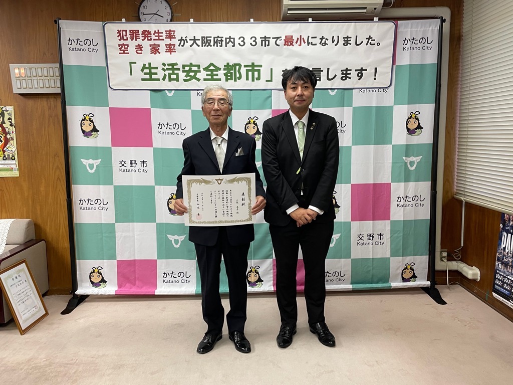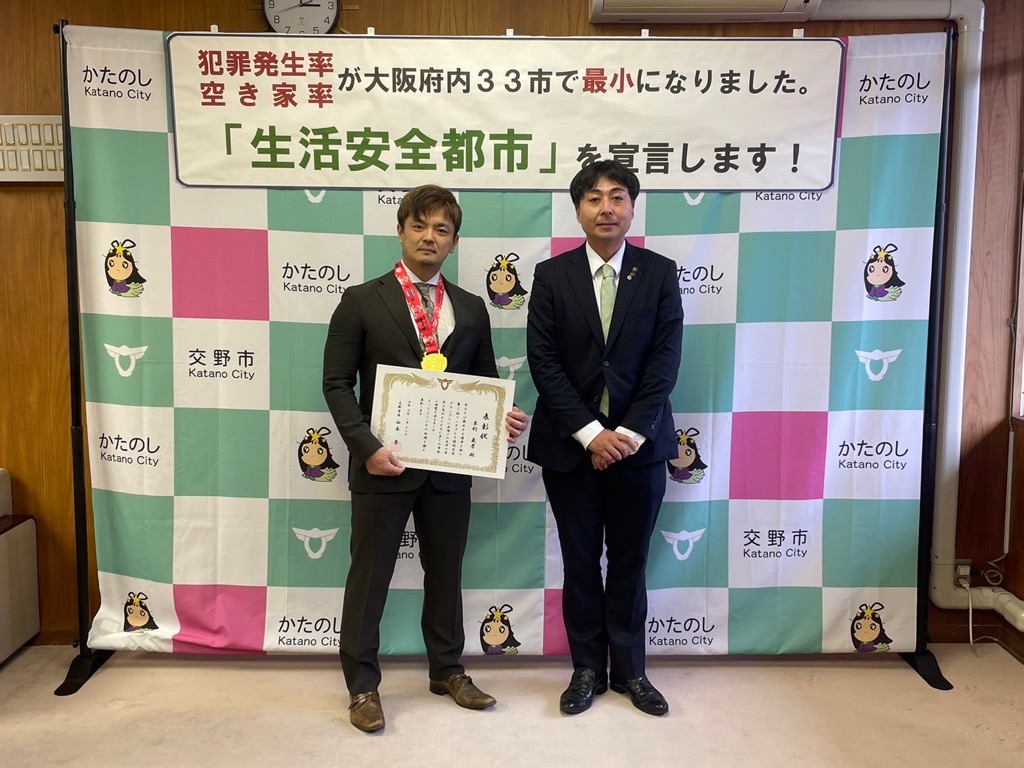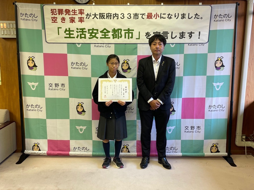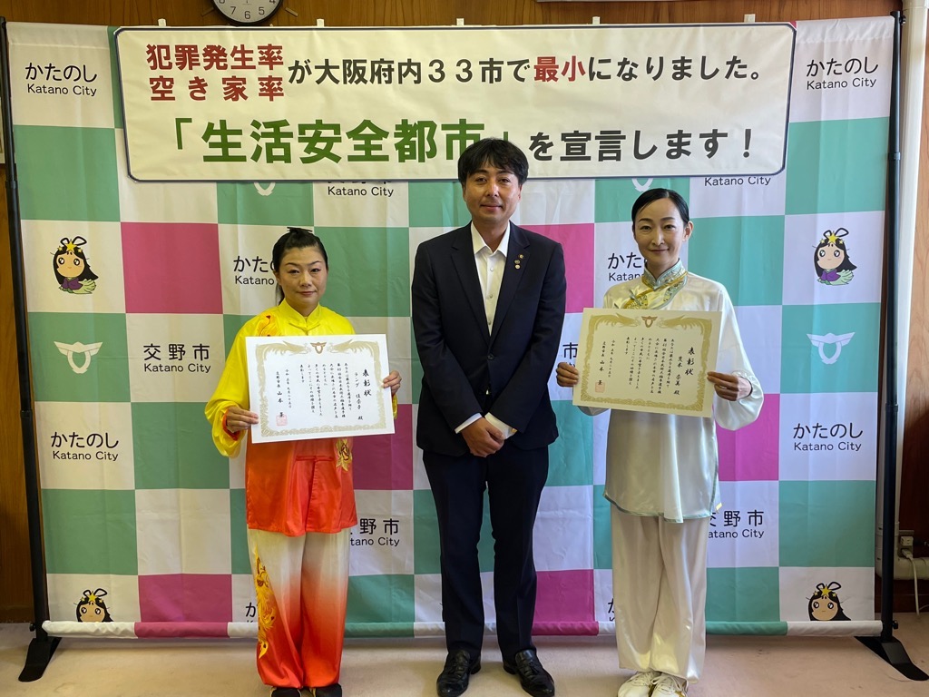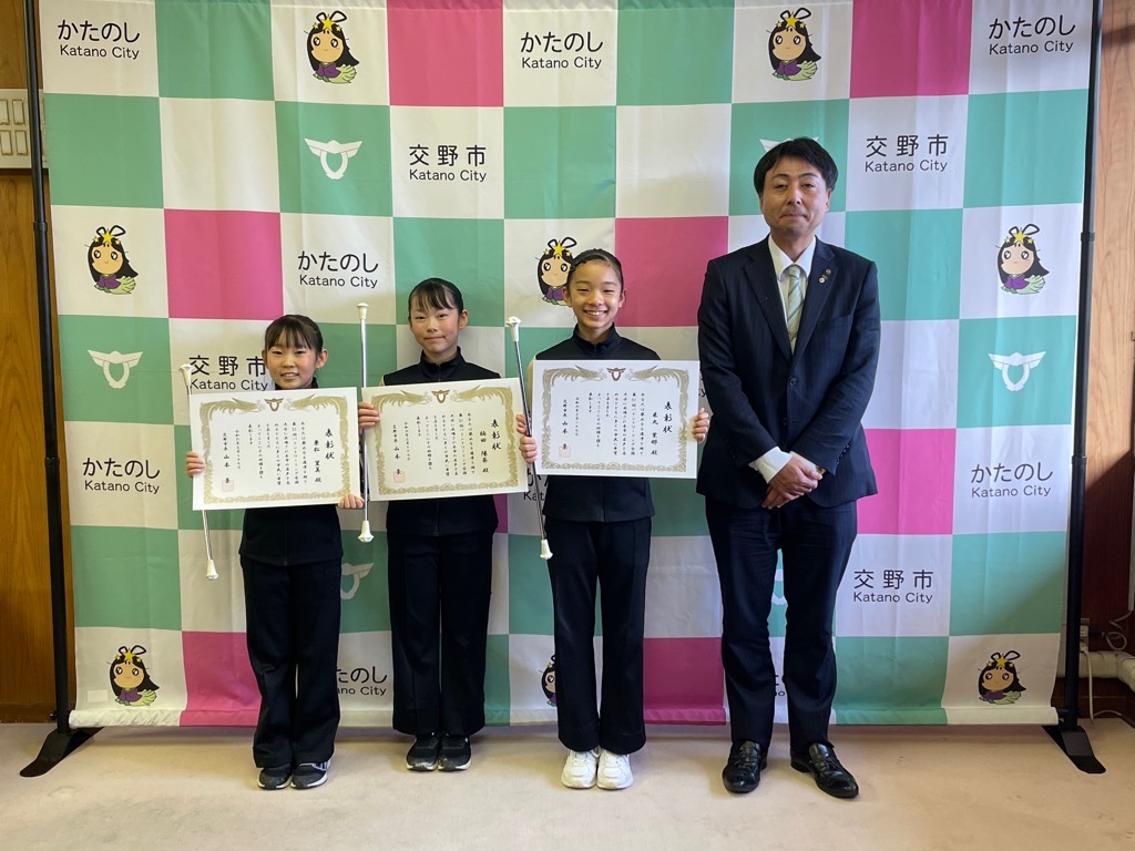 公開日 2024年07月03日 更新日 2025年05月15日 兼松 里実(かねまつ さとみ)さん【妙見坂】/楠田 陽葵(くすだ ひより)さん【星田北】/米丸 茉那(よねまる まな)さん【星田】 【表彰理由】千葉にて開催された第51回バトントワーリング全国大会に出場。 【受賞者からの一言】 兼松 里実さん:全国大会という大きな大会に出れて2位という結果をいただけてとてもうれしかったです! たくさん努力をしてまた全国大会という舞台に立ちたいと思いました! 楠田 陽葵さん:全国大会で2位を取ることができて嬉しかったです。一緒に頑張ったチームメンバー、指導してくださった先生方、支えてくれた家族に感謝の気持ちでいっぱいです。もっと頑張って次は1位を取りたいです。 米丸 茉那さん:バトントワーリング全国大会にて第2位を受賞しました。とてもうれしかったです。でも、1位じゃなかったのがくやしかったです。この良い経験を活かして、これからも努力していきたいです。 松本 明香里(まつもと あかり)さん【郡津】 【表彰理由】静岡にて開催された第27回PIARAピアノコンクール ファイナルジュニアA部門に出場。東京にて開催された第17回ベーテン音楽コンクール全国大会 自由曲コース小学3・4年生の部に出場。 【受賞者からの一言】表彰してもらえてとてもうれしいです。これからもいろいろな曲にチャレンジしてがんばっていきたいと思います。 久保 胡桃(くぼ くるみ)さん【倉治】 【表彰理由】京都にて開催されたNADESHIKO NIPPON2023 LITTLE NADESHIKO 低学年部門に出場し最優秀特別賞を受賞。 【受賞者からの一言】これらの結果はすべて、たくさんの方々の応援・ご協力のおかげです。 なでしこ日本とは、失われていく日本の理想女性像「やまとなでしこ」を日本が誇る『和』を通して発していくコンテストです。 これからも大好きなお着物と日本文化を、たくさんの人に発信していけたらと思います。 ありがとうございました。 末利 義孝(すえとし よしたか)さん【郡津】 【表彰理由】姫路にて開催された第2回ベンチプレス競技日本グランプリ のマスターズ1(40歳~49歳)部門に出場し優勝。 【受賞者からの一言】枚方にある社会医療法人美杉会にて介護職として勤務しながら、日々練習を頑張ってます。仕事とプライベートを両立しやすい環境の為、優勝できたと思います。今後は、アジア大会など代表選手に選ばれるよう頑張ります! 園田 凜乃介(そのだ りんのすけ)さん【私部南】 【表彰事由】2023年少林寺拳法世界大会in Tokyo,Japanに一般男子初段(組演武)の部門にて出場。 【受賞者からの一言】この結果は、先生や相方、部員のみんなや家族、支え、応援してくださった方々がいるおかげで成し遂げられたことです。この感謝の気持ちを忘れずに、一人でも喜んでもらえるよう、今後も邁進していこうと思います。 青山 寛幸(あおやま ひろゆき)さん【梅ケ枝】 【表彰事由】京阪交野線郡津下手踏切内で立ち往生している高齢者女性を救助。 【受賞者からの一言】ニュースで報道されるような事に自分が遭遇するとは思いもしませんでした。救助した女性に怪我は無く、無事にご家族のもとに帰れたと警察の方から教えていただき安心しました。 内藤 圭吾(ないとう けいご)さん【南星台】 【表彰事由】かごしま国民体育大会にテニス競技にて出場。 【受賞者からの一言】立命館守山中学校に通学しております。鹿児島国体に出場しました。盛大な開会式、貴重な経験になりました。生まれ育った交野市で素晴らしい賞を頂き、有難うございます。 伊藤 翠(いとう すい)さん/谷 柚嬉(たに ゆずき)さん/石堂 航輝(いしどう こうき)さん/西村 宗士郎(にしむら そうじろう)さん/伊藤 藍(いとう あい)さん/谷脇 碧(たにわき そら)さん/下川 瑛太(しもかわ えいた)さん/下川 都愛(しもかわ とめ)さん/橋本 彩乃(はしもと あやの)さん/塚本 梓乃(つかもと しの)さん/川端 舞夕(かわばた まゆ)さん/平良 虎太郎(たいら こたろう)/上垣内 優輝(うえがいと ゆうき)さん/沓掛 航大(くつかけ こうた)さん/沓掛 湊人(くつかけ みなと)さん/南野 愛琳(みなみの あいり)さん/上川 遥希(かみかわ はるき)さん/森本 里菜(もりもと りな)さん/森岡 ひかり(もりおか ひかり)さん/山本 陽大(やまもと ひなた)さん/有川 結(ありかわ ゆい)さん【日本空手協会交野青山支部】 【表彰事由】空手道の全国選手権大会に出場。 【受賞者からの一言】今回市長より表彰してもらえてとても嬉しいです。これも師範、先生方が熱心に指導してくれたからだと思います。来年は全国大会3連覇を目指して頑張ります。【伊藤 翠(いとう すい)さんより】 平野 奨貴(ひらの しょうき)さん【私市】 【表彰事由】岡山にて開催された自転車競技の全国大会(全日本BMXフリースタイル選手権)に出場。 【受賞者からの一言】全日本という大きな大会で2位をとれてとても嬉しかったです。もっと上手くなって世界で活躍できるような選手になりたいです。 𠮷坂 泰彦(よしさか やすひこ)さん【私部西