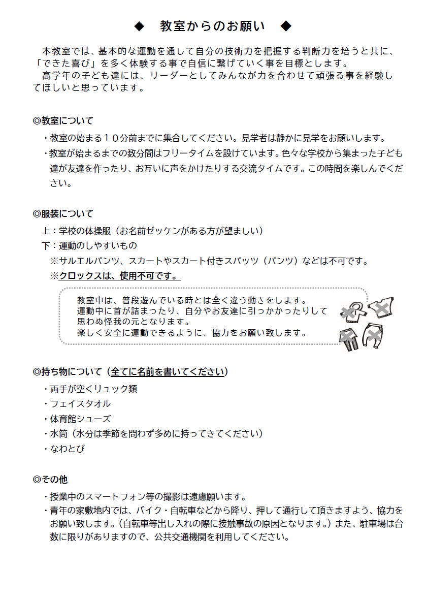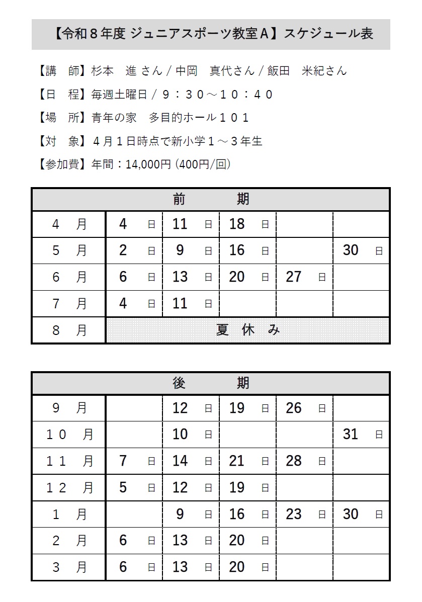 令和8年度 ジュニアスポーツ教室Aへの参加をご希望の方は、こちらのページの下部にあるフォームよりお申し込みください。